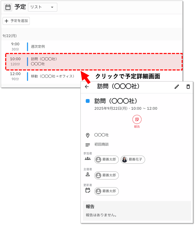 メニューから「予定」を選択して予定画面を開きます。予定をクリックすると予定詳細画面が開きます。