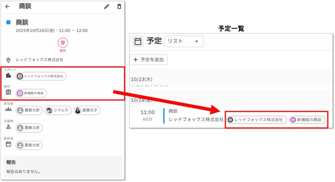 スポットや案件を紐づけた場合は、予定一覧にも表示されます。