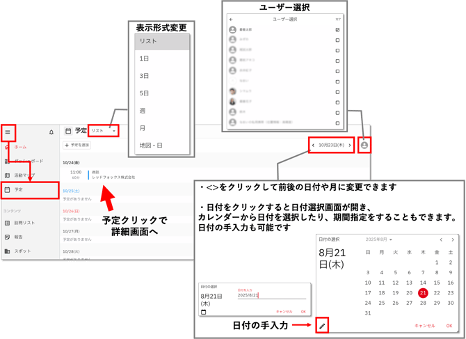 予定画面は表示形式を変更したり、ユーザーを選択(複数選択も可能)してご活用ください。