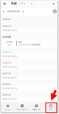 スマートフォンでは、画面下部のメニューから「予定」をタップします。