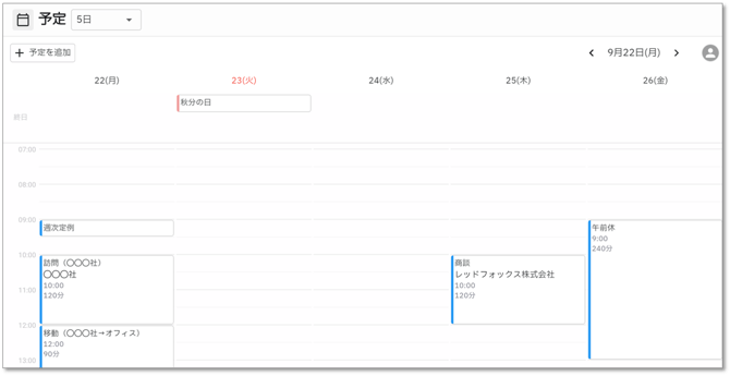 - 3日、5日、週:それぞれの期間分の予定を横並びで表示します。