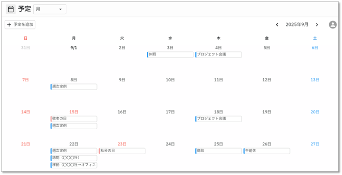 - 月:1か月の予定をカレンダー形式で表示します。