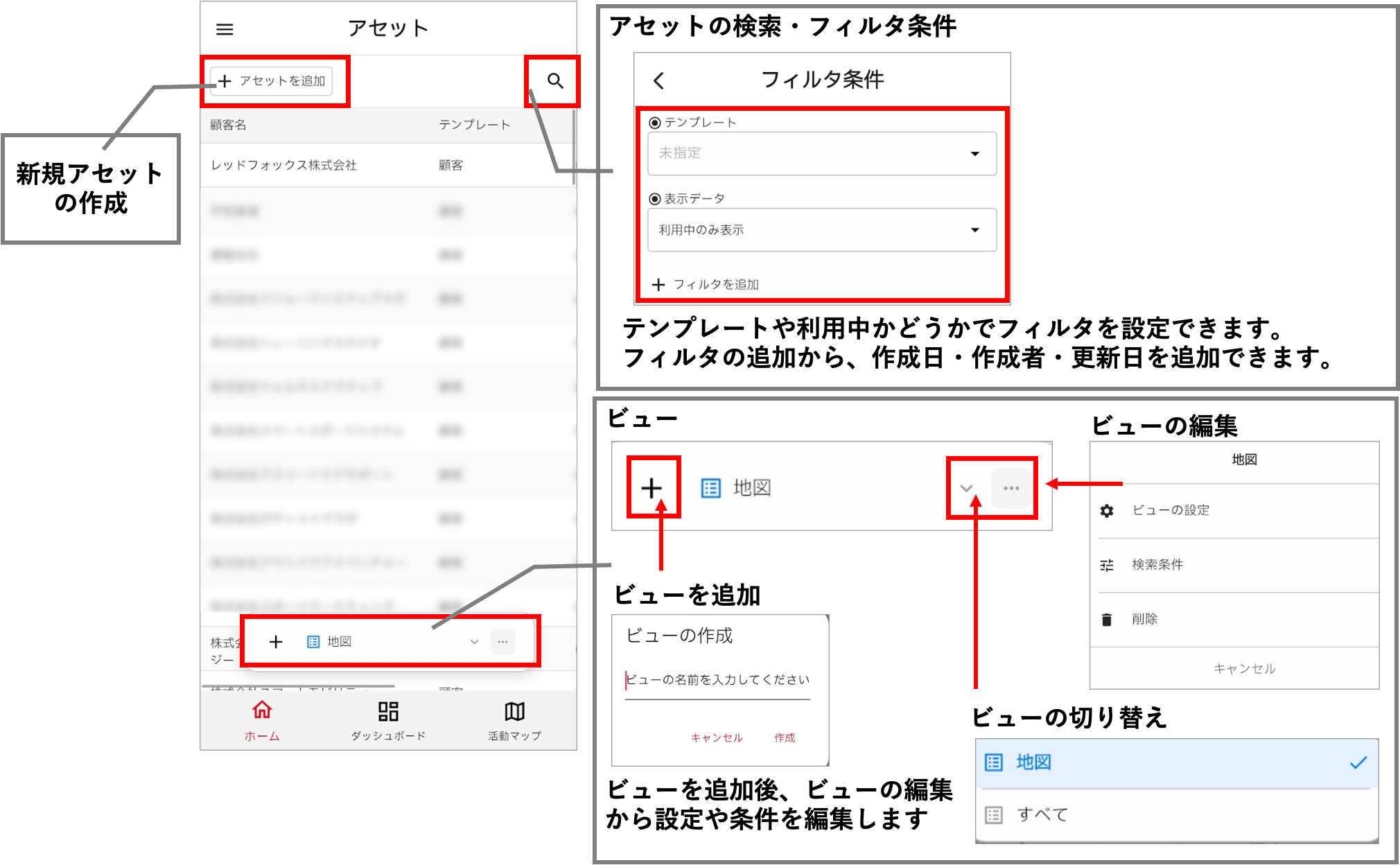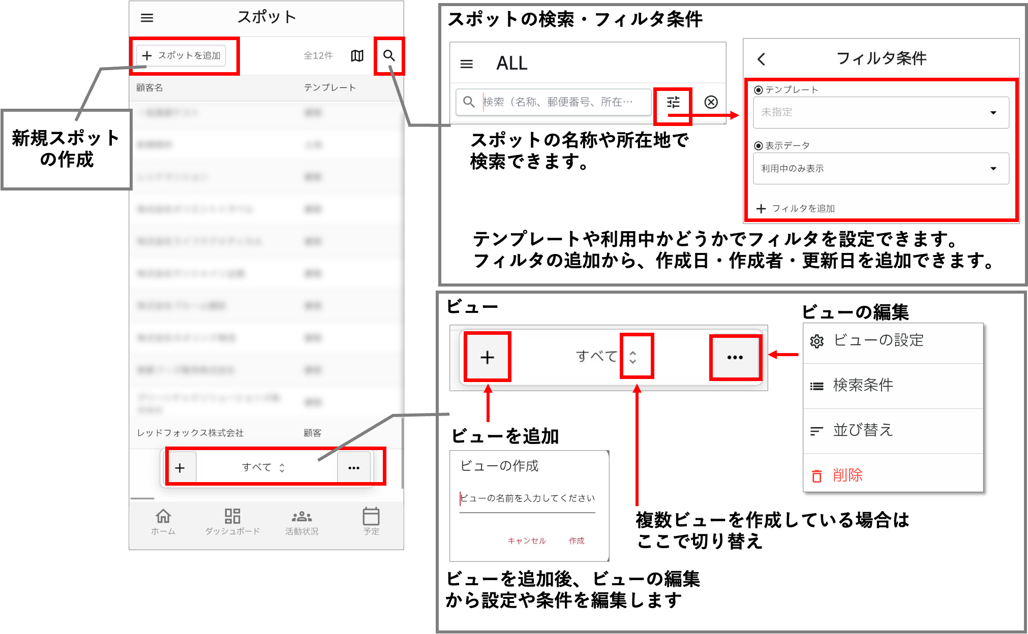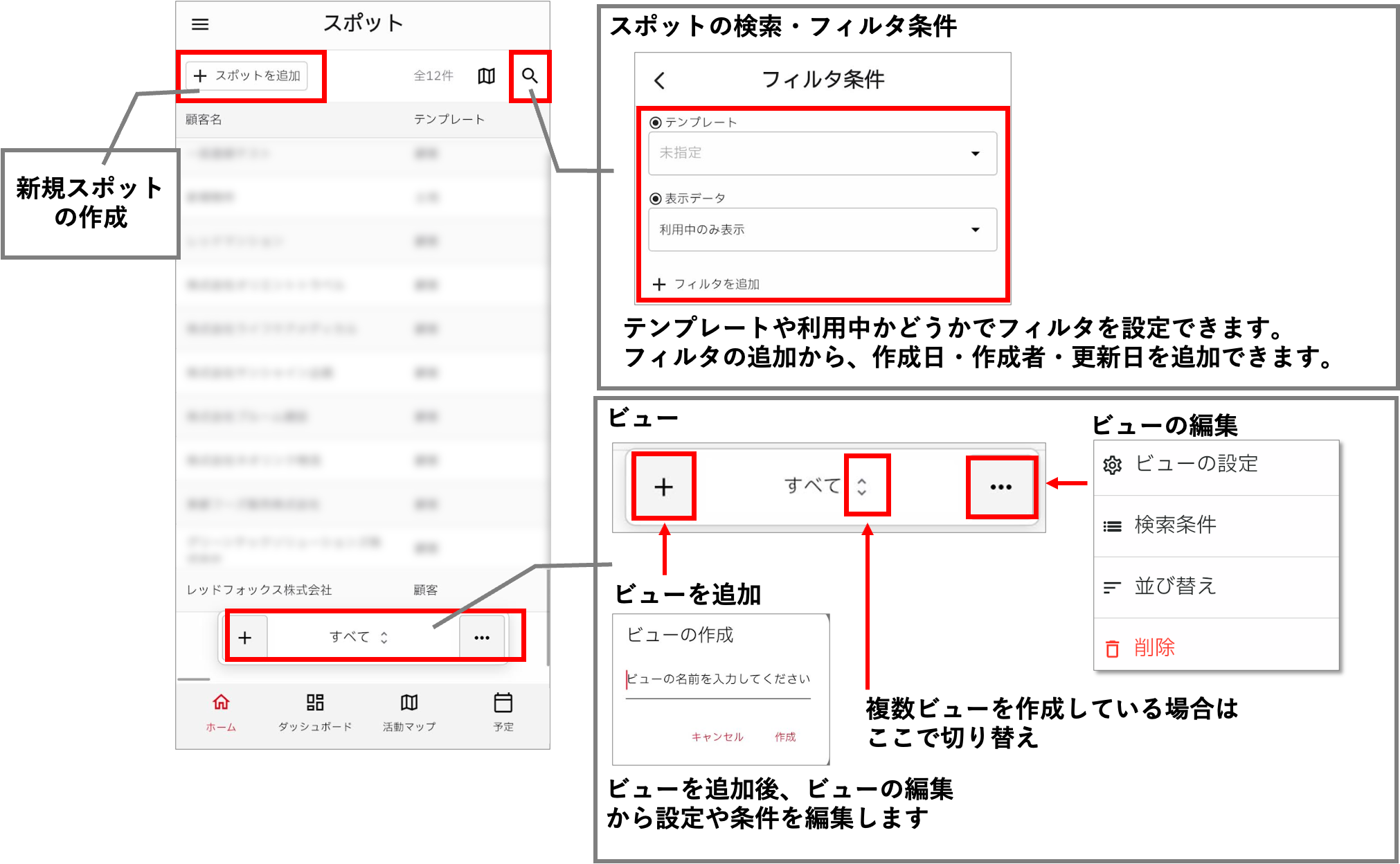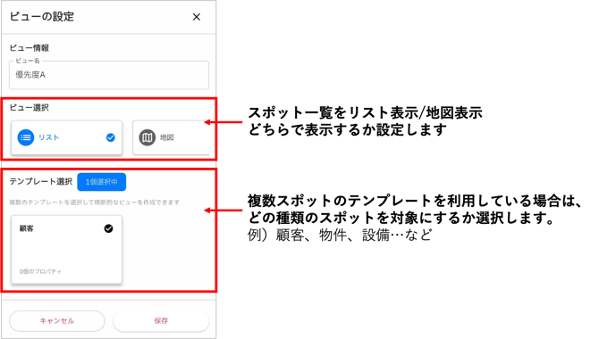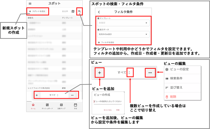 スポット一覧画面では、スポットの追加や検索ができます。また、スポット一覧画面では、「ビュー」を作成することができます。スポットを見たい表示形式(地図/リスト)や条件にあわせて複数ビューを作成し、状況に応じてビューを切り替えながらスポットを確認できます。