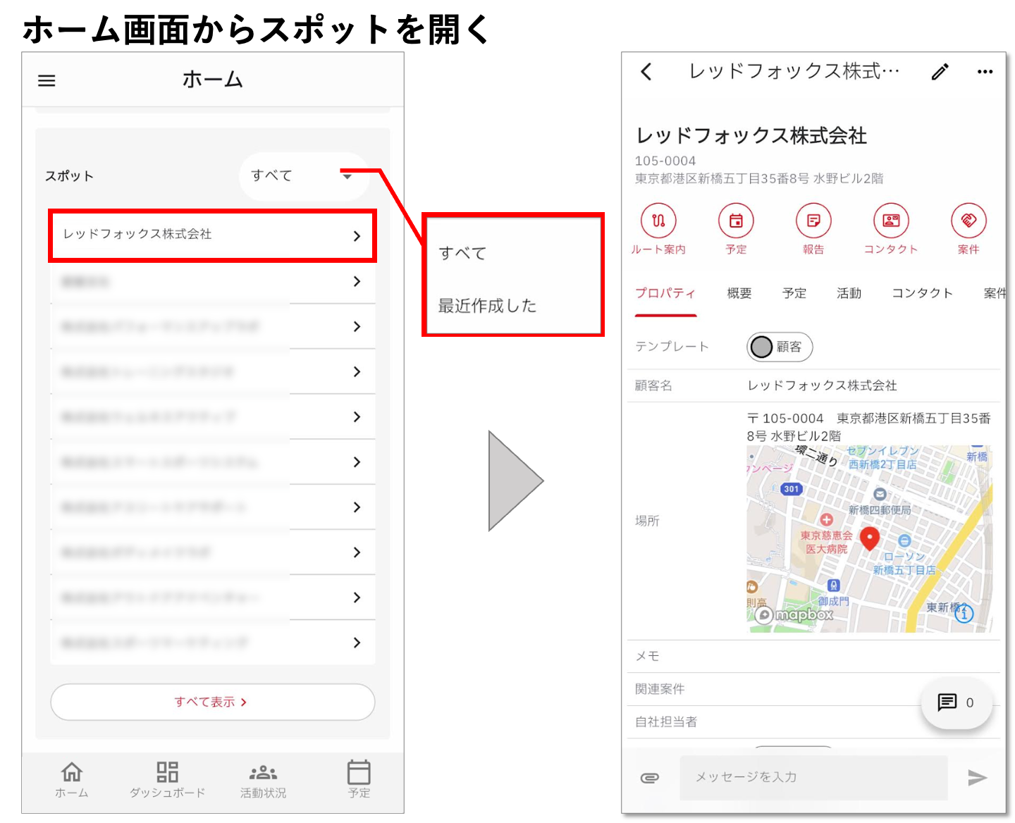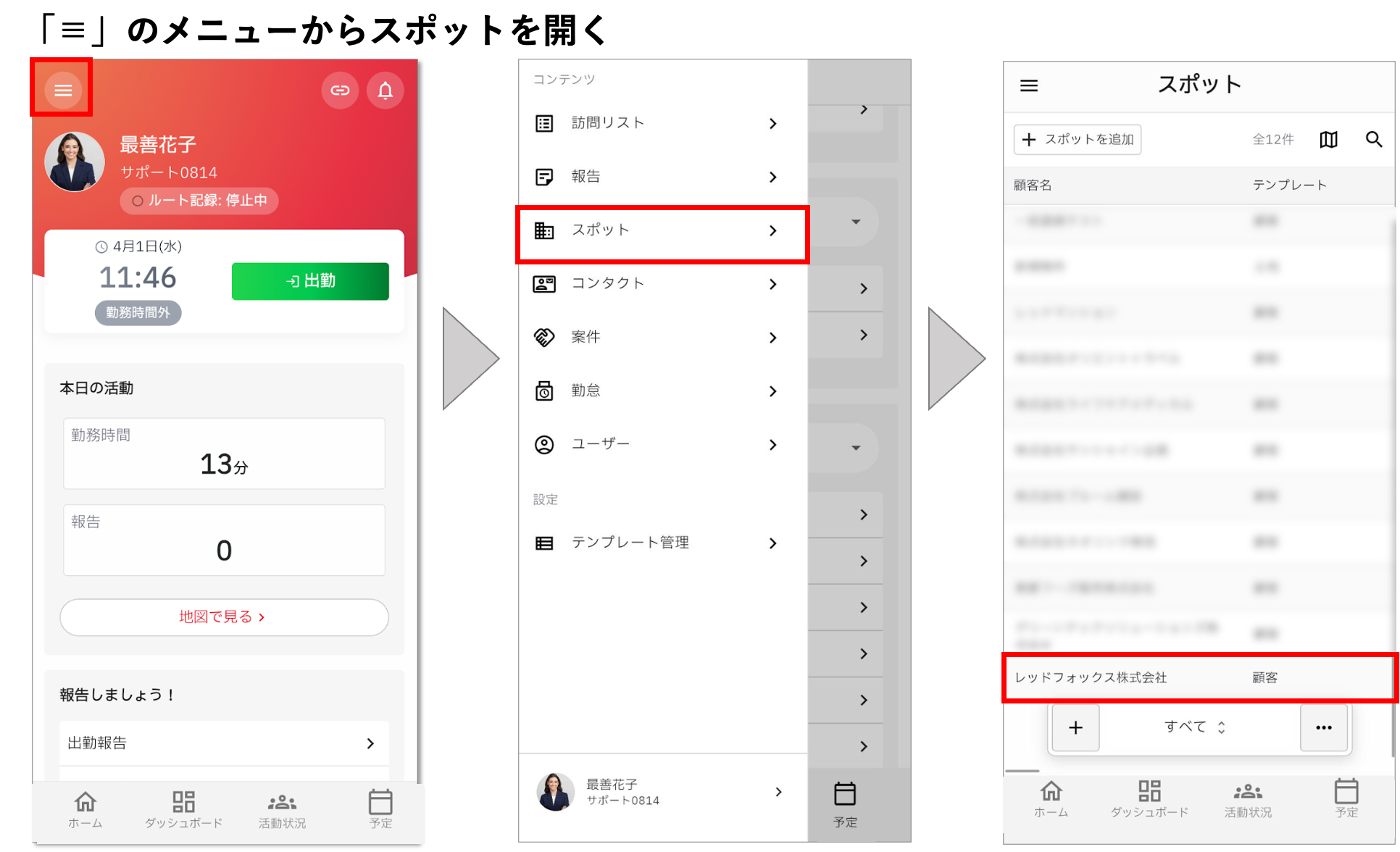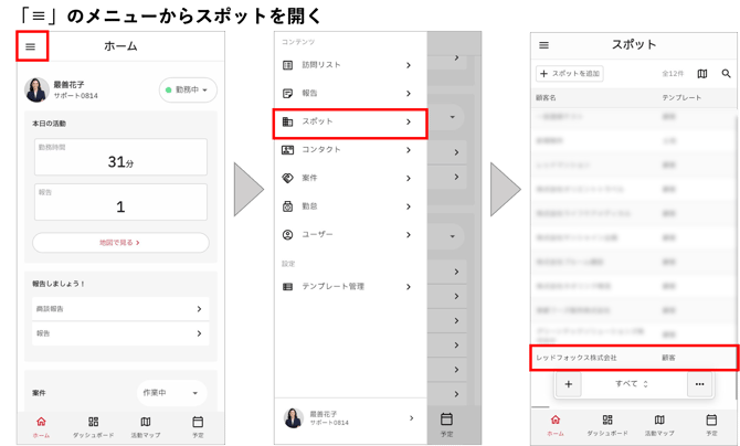 スポットはホーム画面や、cyzen pro左上の「≡」内にある「スポット」メニューから開くことができます。※PCでご利用中の場合は、画面左側に「スポット」が表示されています。