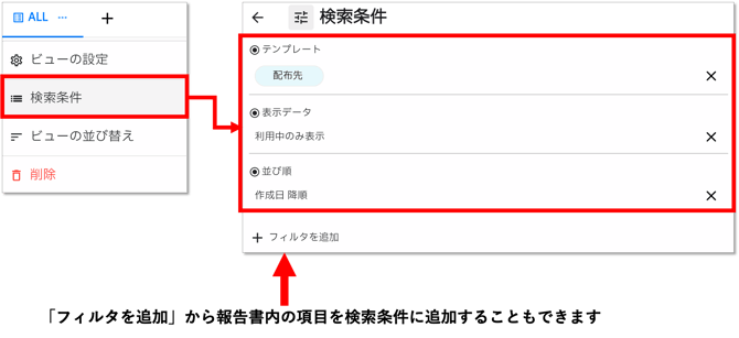 テンプレートや報告書の有効・無効、作成日などでビューに表示される報告書の条件を指定できます。「フィルタを追加」から報告書内の項目を指定することもできます。