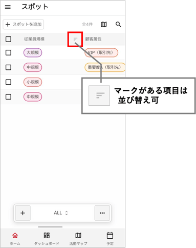 スポット一覧では、日付や選択肢項目など一部の項目で並び替えができます。