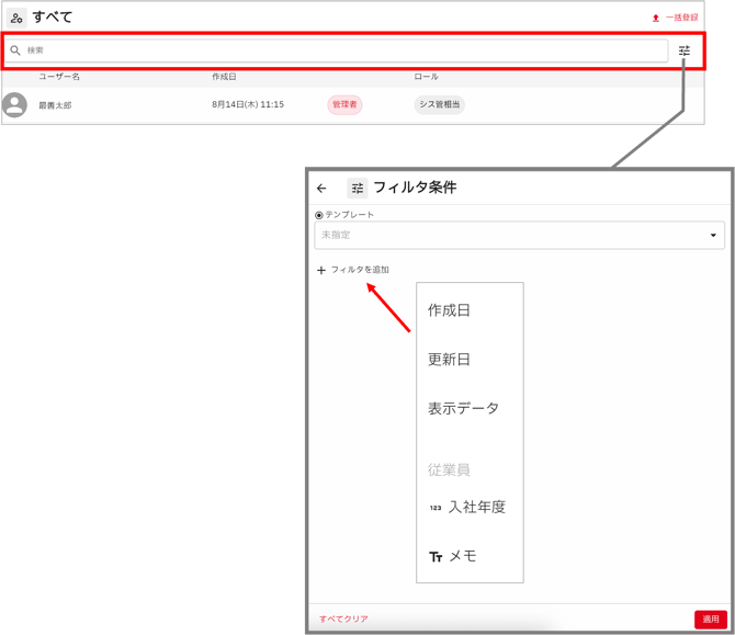 ユーザーを検索する場合は、検索欄に検索ワードを入れて検索したり、フィルタ条件を設定して絞り込むことができます。