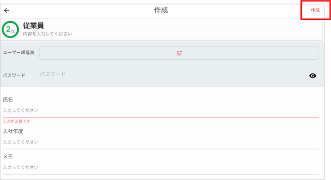 - ユーザー情報の入力が完了したら、右上の「作成」をクリックしてユーザー登録完了です。