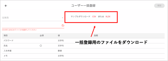 - 一括登録用のファイルをダウンロードします。対象のテンプレートを選んで、CSVもしくはXLSXファイルをクリックします。