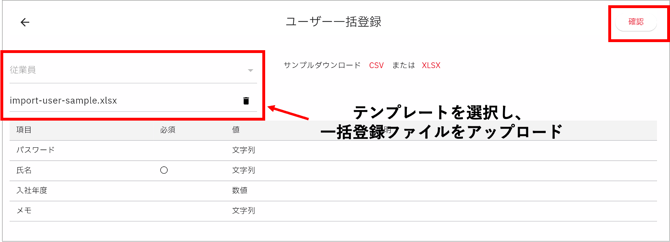 - サンプルファイルに登録内容を設定したら、ユーザー一括登録画面で再度テンプレートを選択し、ファイルをアップロードします。