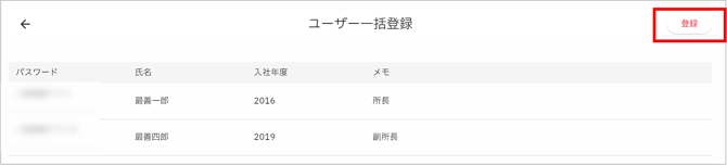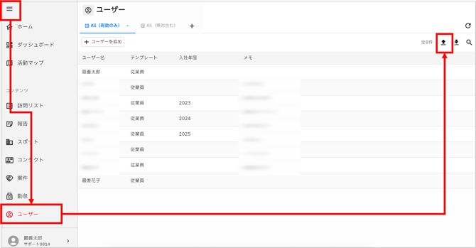 - ユーザー画面が開いたら、右上にある一括登録ボタン「↑」をクリックします。