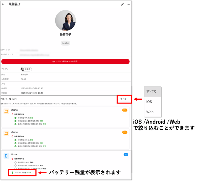 ユーザー詳細画面からは、ログイン案内メールを送ったり、ログインしているデバイス一覧を表示させ、位置情報の設定状況やバッテリー残量も確認できます。