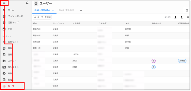 メニューから「ユーザー」を選択してユーザー画面を開きます。