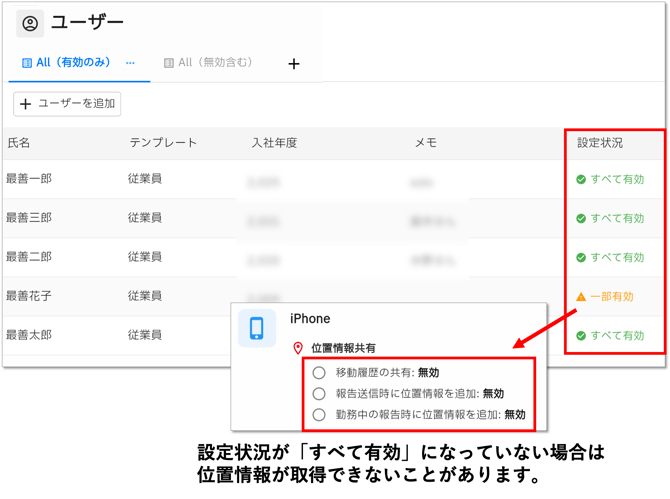 ユーザー一覧では、位置情報取得に関する設定状況が確認できます。