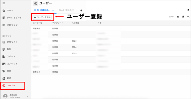 - ユーザーの個別登録はユーザー画面の「+ユーザーを追加」から行います。