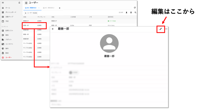 - ユーザー詳細画面右上の鉛筆マークから編集ができます。