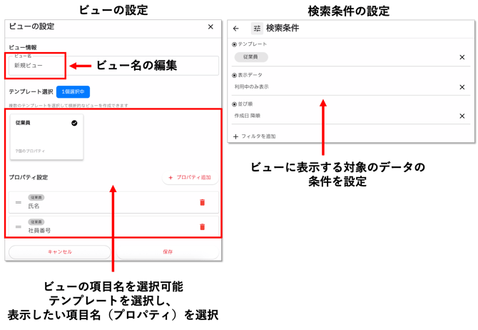 ビューの設定や検索条件を指定して、ビューに表示するデータや項目名を自由に設定できます。