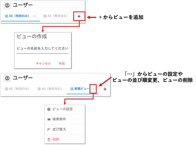 ユーザー画面では、「ビュー」を作成することができます。見たい項目や条件にあわせて複数ビューを作成し、状況に応じてビューを切り替えながらユーザーを確認できます。
