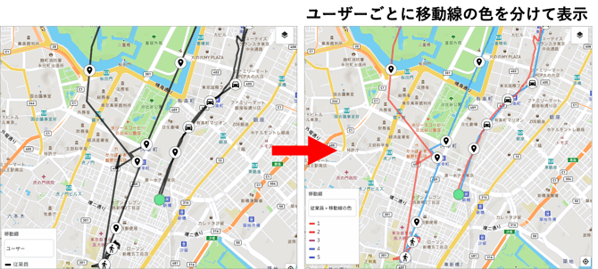 💡 ユーザー登録で、ユーザーごとの移動線の色や位置情報の精度を設定することができます。活動マップでユーザーごとに移動線をみたい場合に設定しておくと便利です。