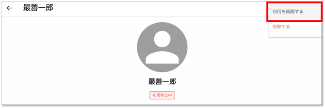 - 利用を再開したい場合は、利用停止中ユーザーの右上「…」から利用を再開するを選択します。