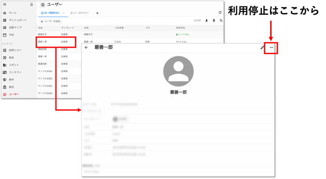 - ユーザー詳細画面右上の「…」から利用停止を選択します。