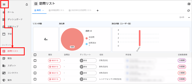 ホーム画面のメニューから訪問リストを開くことができます。