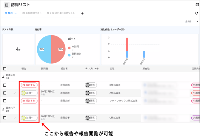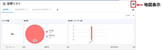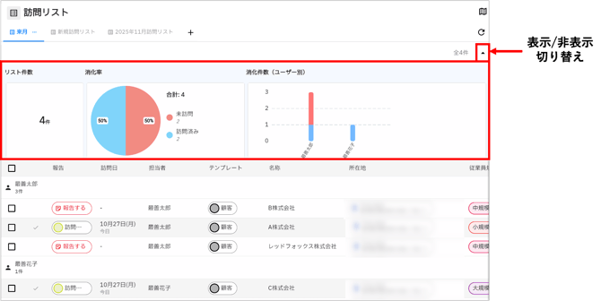 訪問リストの上部には、「リスト件数」や「消化率」、「ユーザー別の消化率」が表示されます。対象の報告が行われ、「訪問完了=消し込み」が行われると、グラフに反映され訪問状況を確認できます。