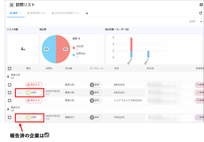 対象の報告が作成されると、その企業は「訪問済」となり、リストの左側に「✔︎」が付きます。消化率やユーザー別消化率にも反映されます。