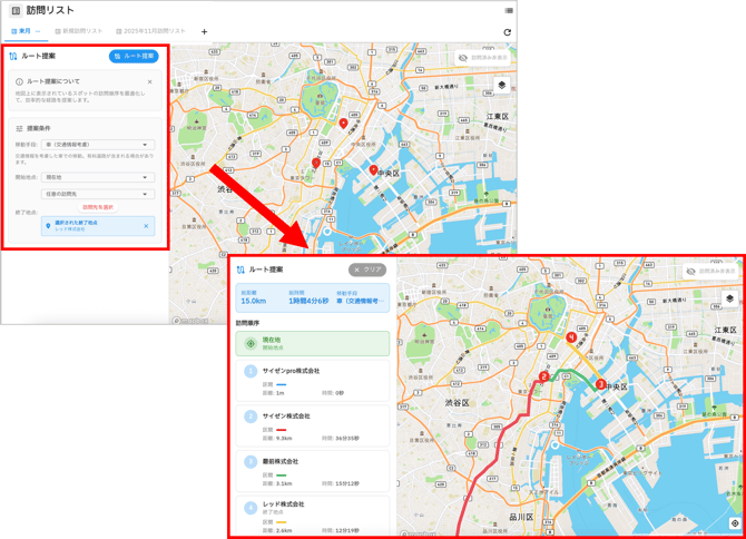 訪問リストを地図表示に切り替えると、訪問ルートの提案も可能です。※訪問ルートの提案はPremiumプランをご契約の方のみ