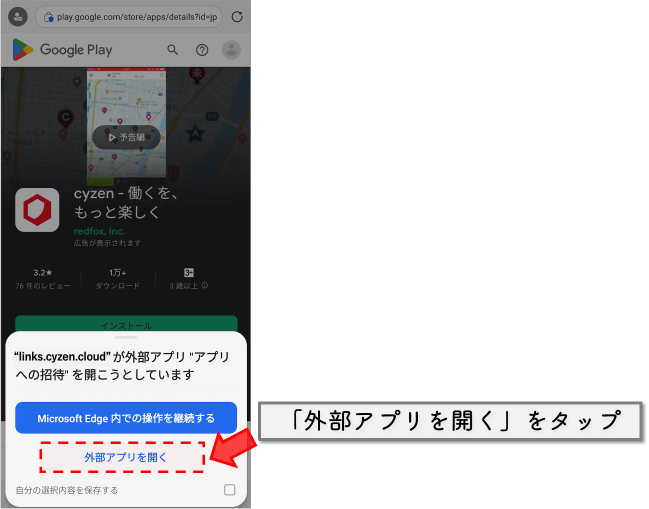 Microsoft Edgeを利用している場合は、以下画面が表示されたら、「外部アプリを開く」をタップしてください。