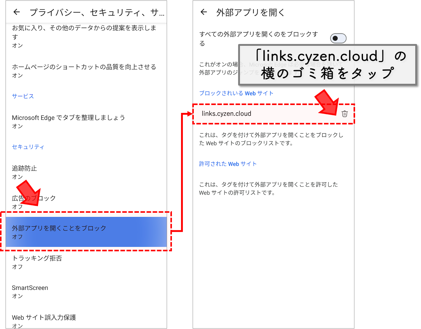 - 「ブロックされているwebサイト」から「links.cyzen.cloud」(※)の横とのゴミ箱をタップして削除します。