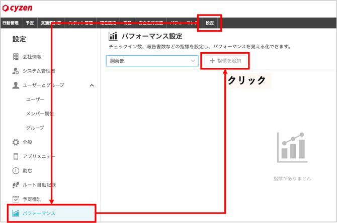 管理サイトでは、グループごとにパフォーマンスの指標を作成することができます。指標は複数作成でき(1グループ最大24個の指標が作成できます)、指標ごとに目標値(グループ/個人)も設定することができます。