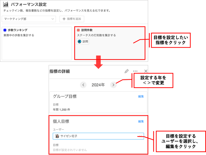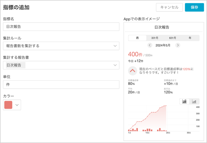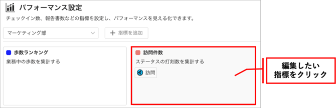 - 指標名:指標名を設定します。(「訪問件数」「名刺獲得枚数」など)