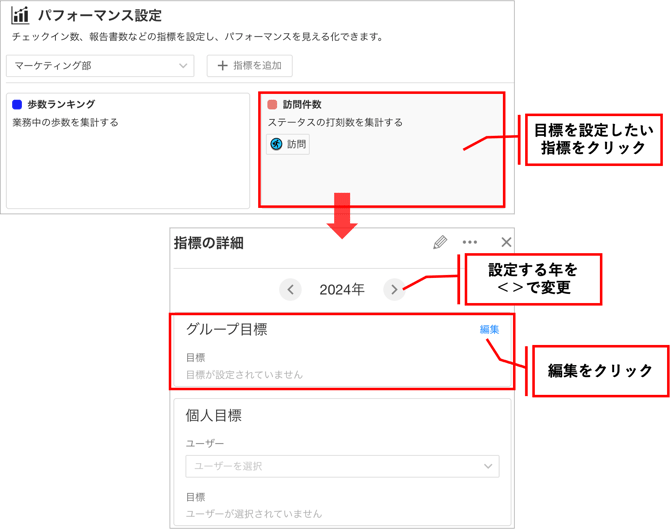 - 指標詳細のグループ目標の「編集」をクリックします。設定する年を<>で切り替えると、