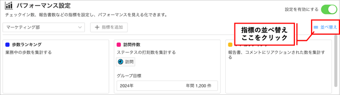 - パフォーマンス設定画面右上の「並べ替え」をクリックします。