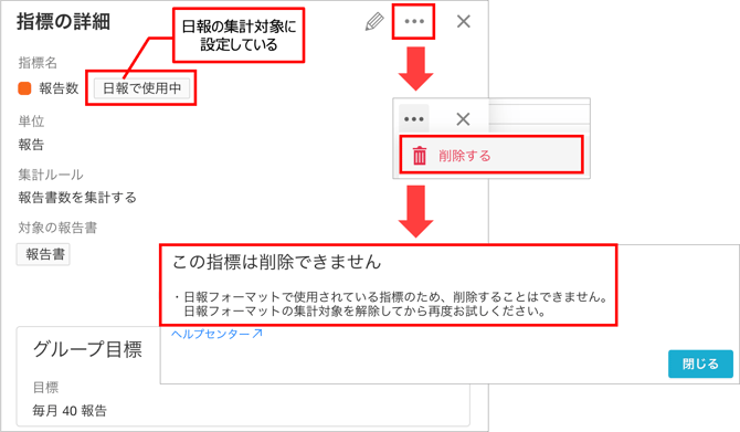 ※日報フォーマットで「集計対象」として設定している指標は削除することができません。削除する場合は、日報フォーマット画面で集計対象から外してから削除してください。