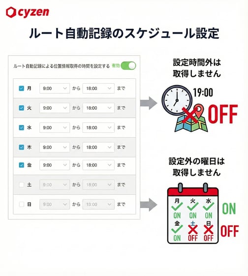 cyzenには、ルート自動記録を取得する時間や曜日を設定することができます。設定した時間以外はルート自動記録の取得が止まります。(設定はこちら)