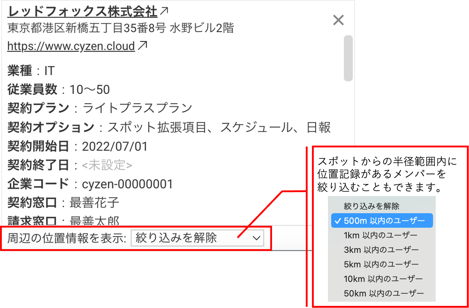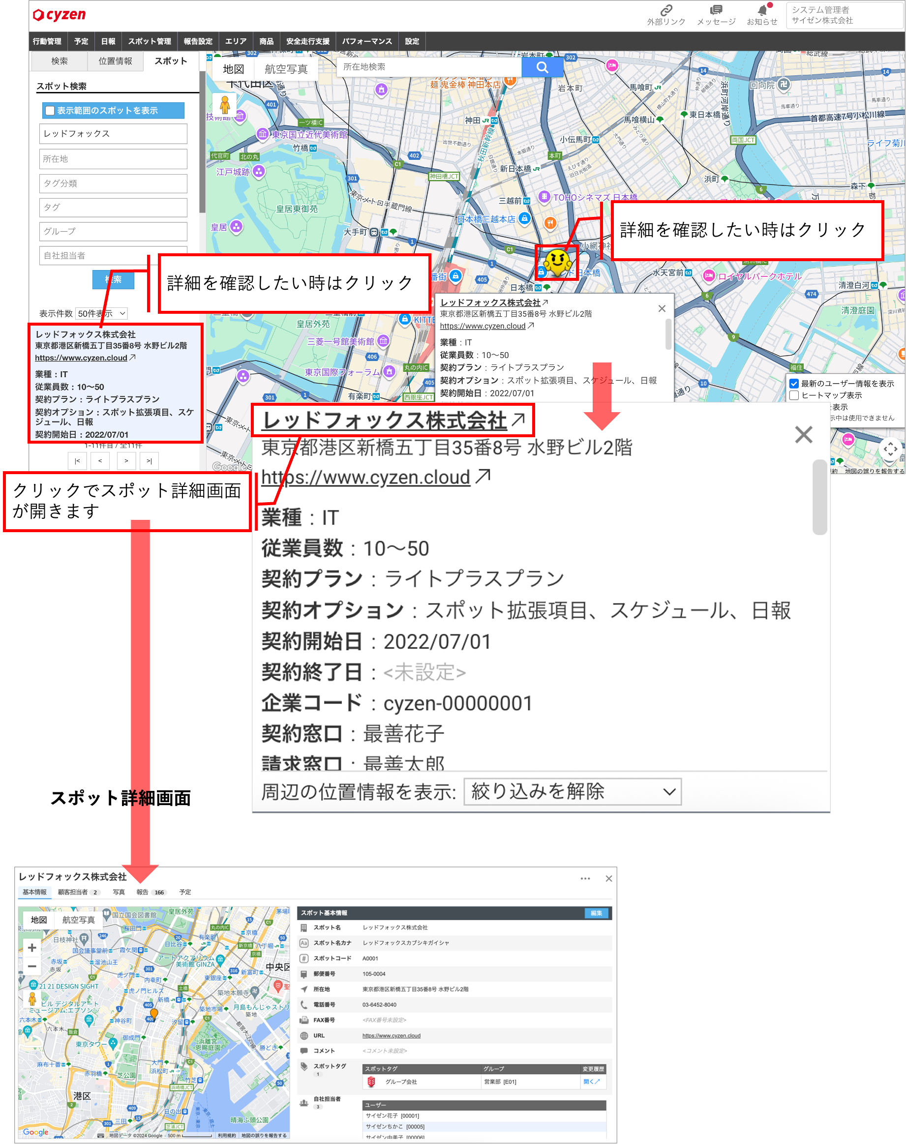 ・自社担当者:スポットに登録された自社担当者で検索できます - 左側のスポット一覧、もしくはスポットアイコンをクリックすると、詳細が表示されます。さらにスポット名をクリックするとスポット詳細画面が開きます。