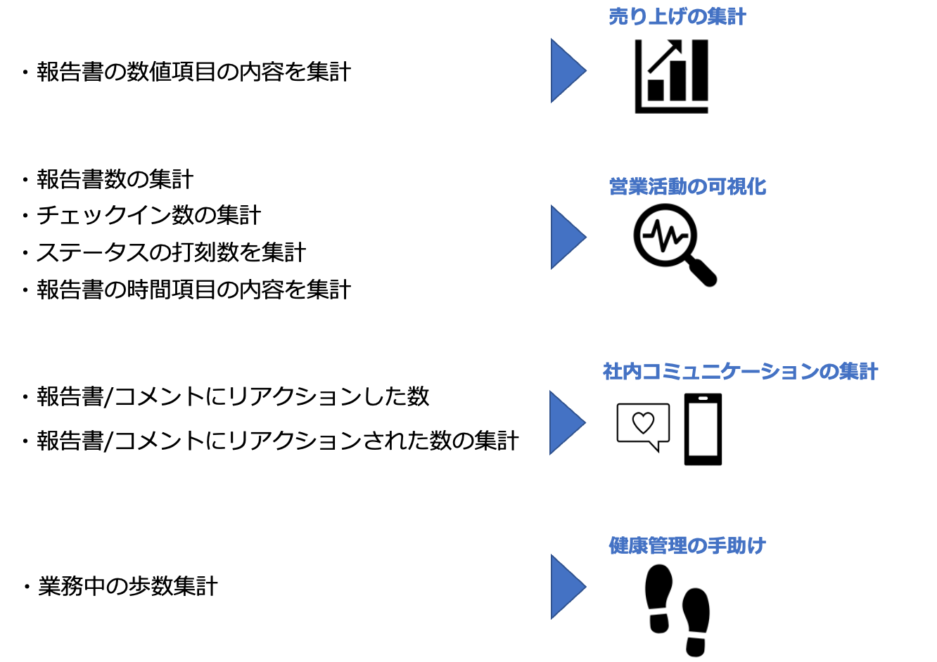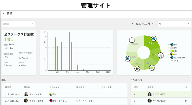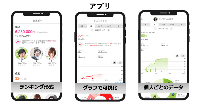 パフォーマンスとは パフォーマンスとはcyzenで取得できる様々なデータを集計し、ランキング形式で表示したり、グループごとや個人ごとにグラフで可視化できる機能です。 パフォーマンス機能の設定や指標の設定は管理サイトで行います。パフォーマンスの閲覧は管理サイトからもアプリからも行うことができます。 パフォーマンス機能では、以下のようなデータを集計し、役立てることができます。 ※パフォーマンスは、一部プランではオプション契約となります。興味のある方は弊社カスタマーサポートまでお問い合わせください。