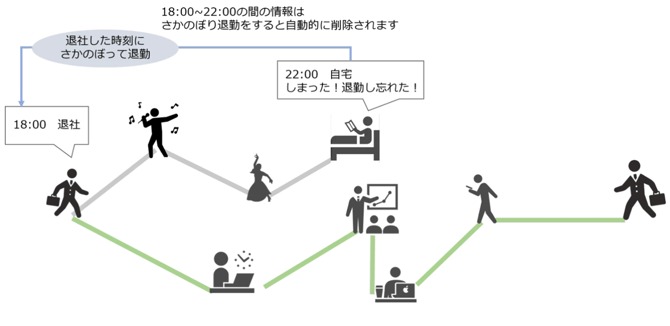 そんなときは、「さかのぼり退勤」を使って、勤務終了の時間までさかのぼって退勤することで、退勤以降の位置情報は履歴に残らなくなります。※ さかのぼり退勤は1か月以内に行ってください