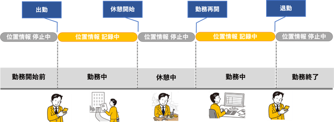 また、「休憩開始」を開始すると位置情報の取得を停止します。「勤務再開」時にはまた位置情報の取得を開始します。