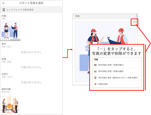 - 報告先のスポット写真を選択:報告時にスポットにチェックインしたり、スポットを選択した時に、そのスポットの写真管理から添付する写真を選択できます。(アプリのみ)