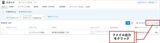 - 削除対象のスポットだけになるよう検索条件を指定し、ファイル出力します。
