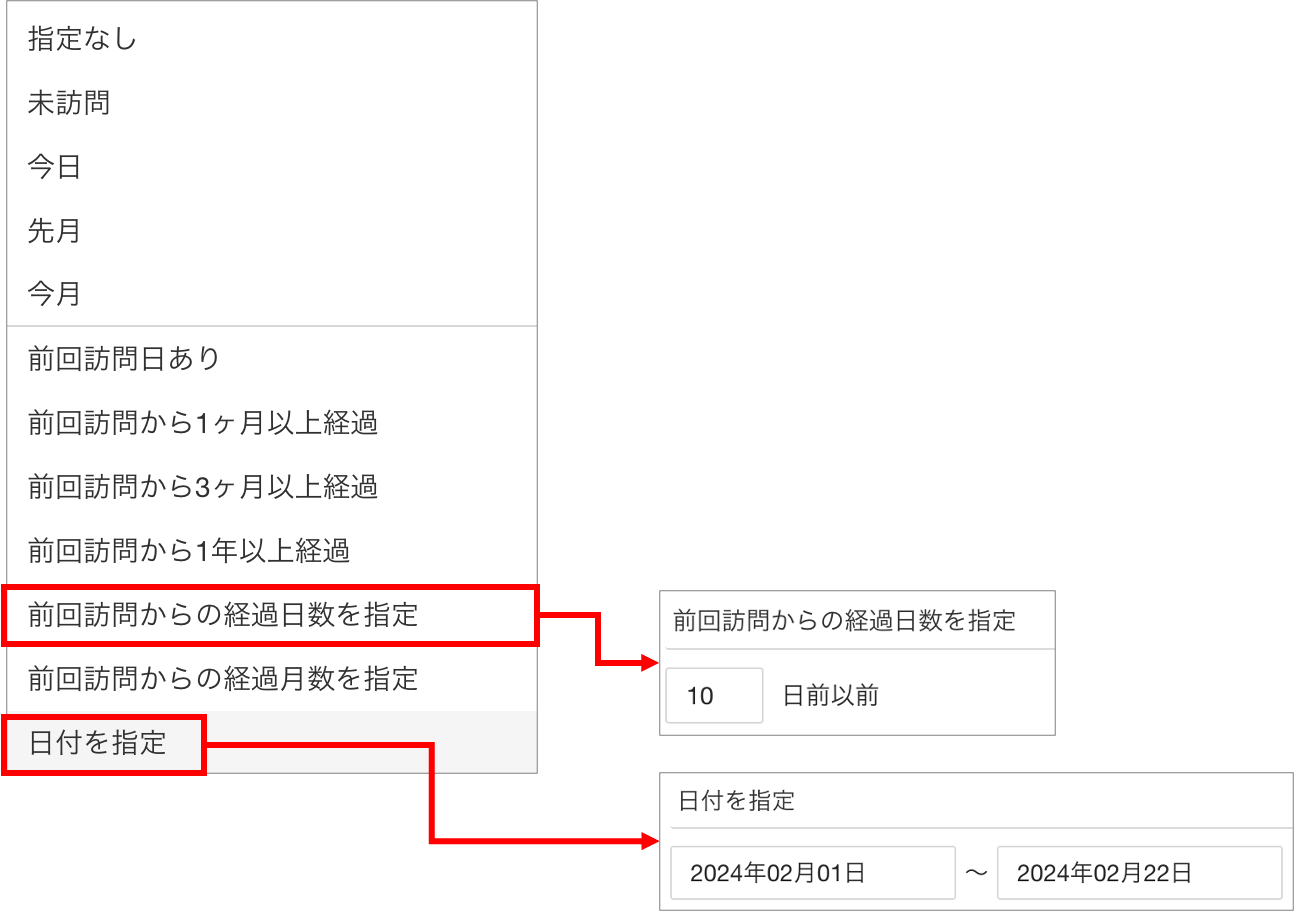 - 前回訪問日:グループを指定し、グループ内の誰かが訪問した前回訪問日で絞り込みできます。