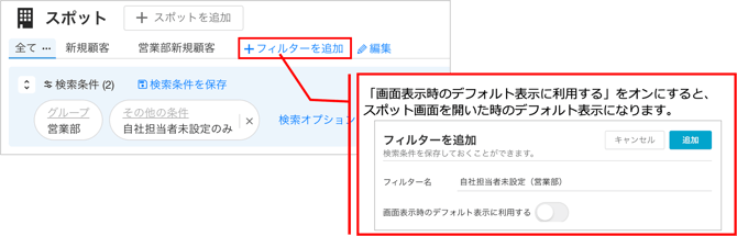 - 検索後、検索条件を保存したい場合は、「フィルターを追加」から検索条件に名前をつけて保存します。