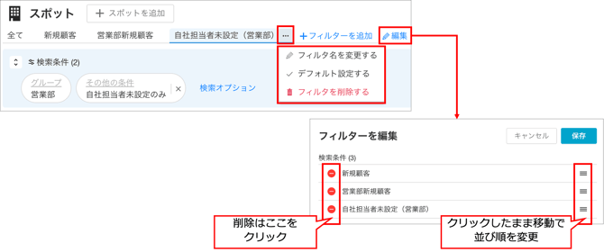 - 保存した検索条件のフィルター名変更、デフォルト設定の変更、フィルターの削除は、フィルター名横の「…」から行います。「編集」をクリックすると、保存したフィルターの一覧が表示され、並び順の変更や削除が可能です。