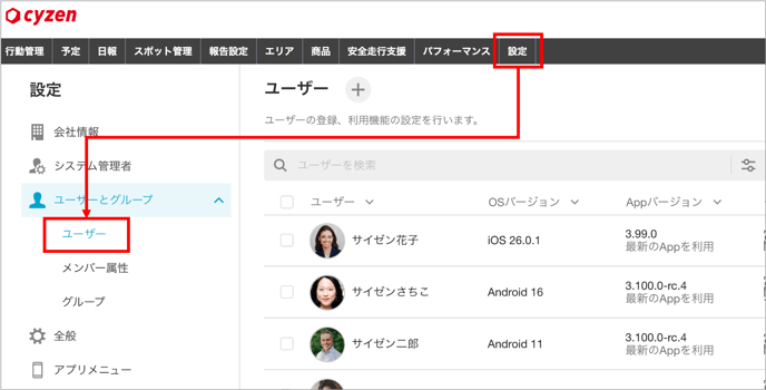 cyzen管理サイトにログイン後、メニューから[設定] > [ユーザーとグループ] > [ユーザー] でユーザー画面を開きます。