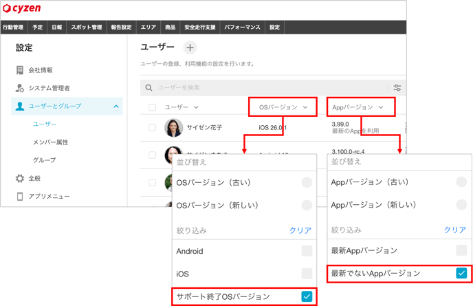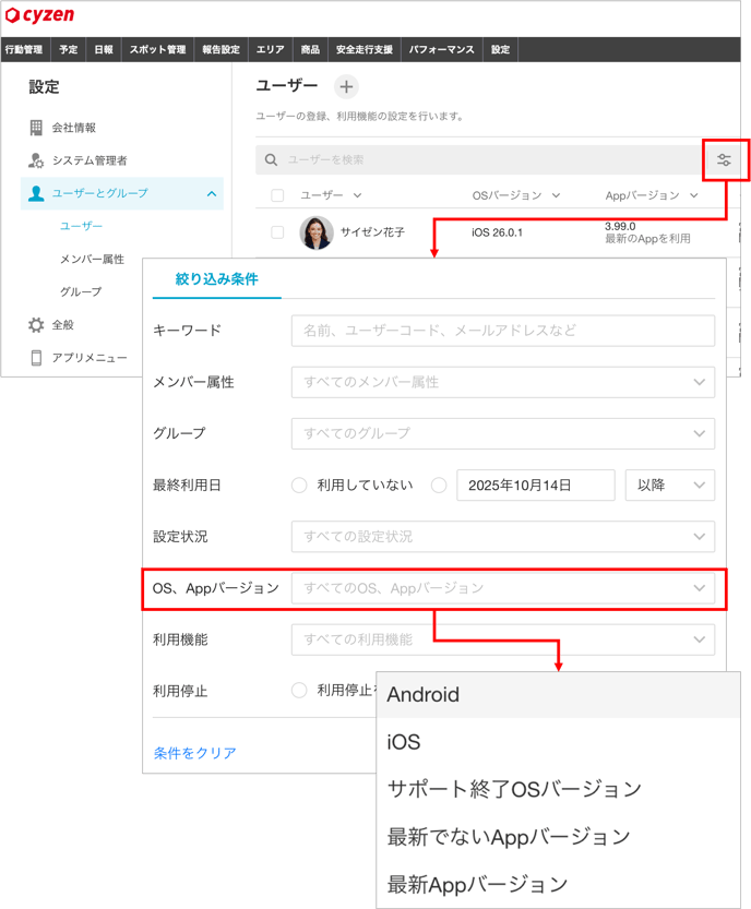 検索条件の中にある「OS、Appバージョン」から、もしくは一覧の列名にある「OSバージョン」や「Appバージョン」で絞り込みや並び替えを行い、サポート終了になるOSのユーザー有無や、最新のアプリを利用していないユーザー有無を確認してください。