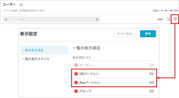 ※OSバージョンが表示されていない場合は、ユーザー画面右上の「表示設定」で表示項目に追加してください。