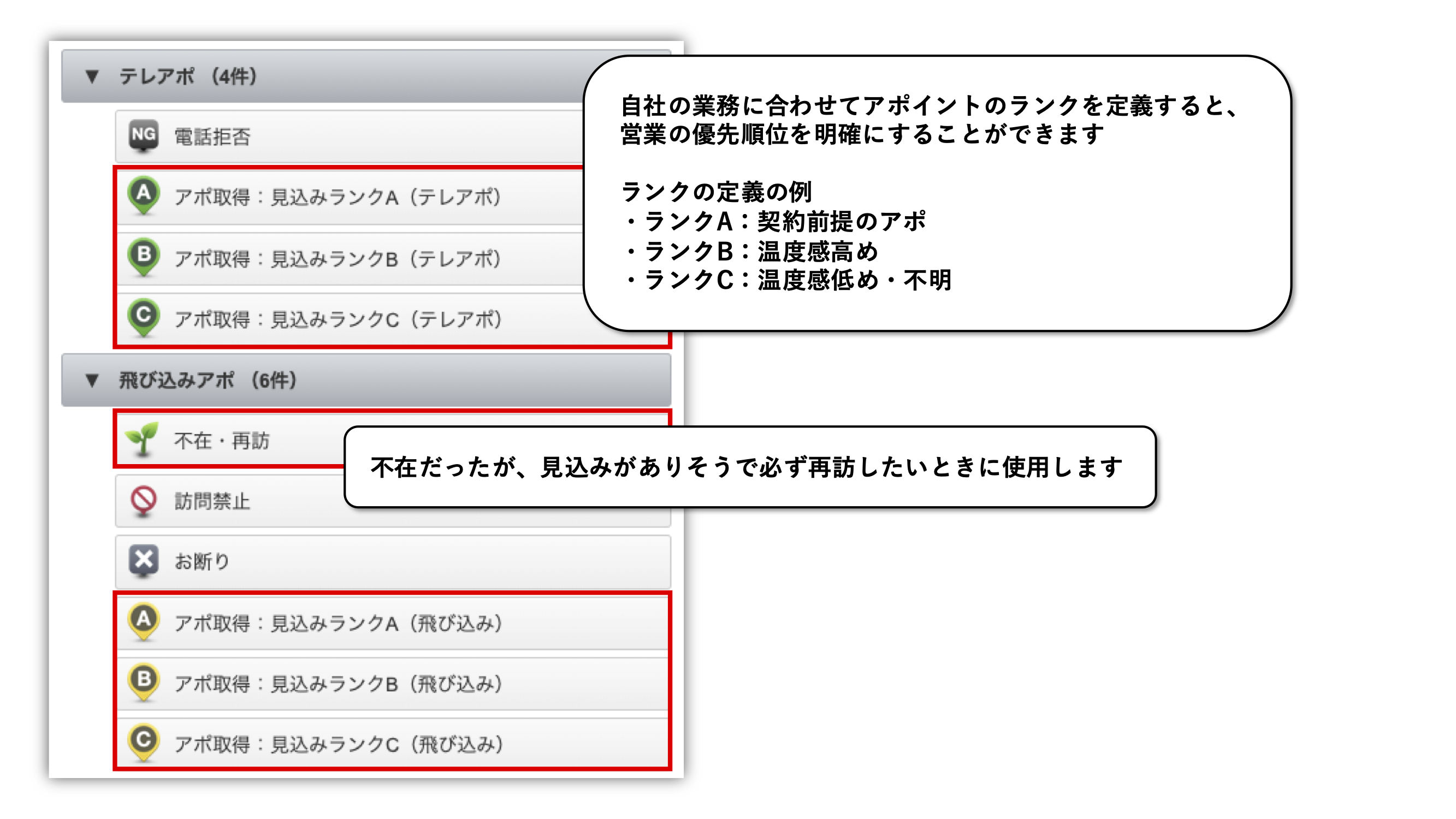 訪問結果を見える化できるよう、「営業フェーズ」に合わせて設定するのがおすすめ!